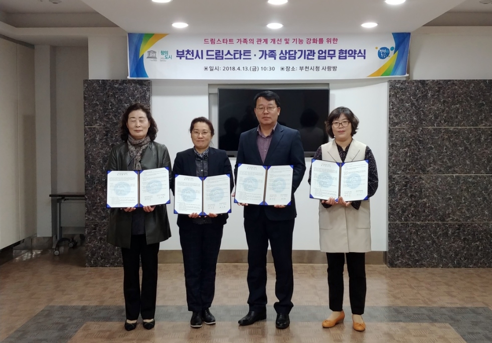 사진설명: 부천시 드림스타트는 심리발달센터 3곳과 협력해 가족상담 서비스를 제공한다. (사진은 지난 4월 13일에 진행된 협약식)
