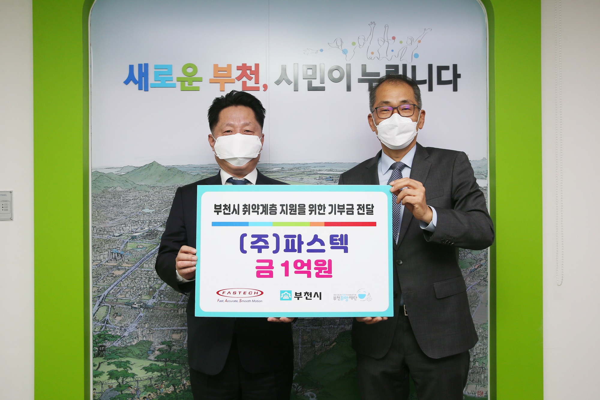 부천시가 지난 26일 관내 모션 컨트롤 분야 전문기업 ㈜파스텍(대표 송진일)에서 저소득 취약계층 지원을 위해 1억 원을 기탁했다고 밝혔다.