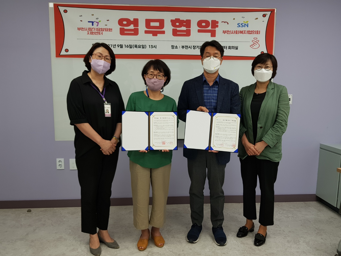 부천시장기요양요원지원센터(이영주 센터장)와 부천시사회복지협의회(최종복 회장)는 지난 16일 장기요양요원지원센터 회의실에서 양 기관 대표 및 직원들이 참석한 가운데 업무 협약을 체결했다고 밝혔다.