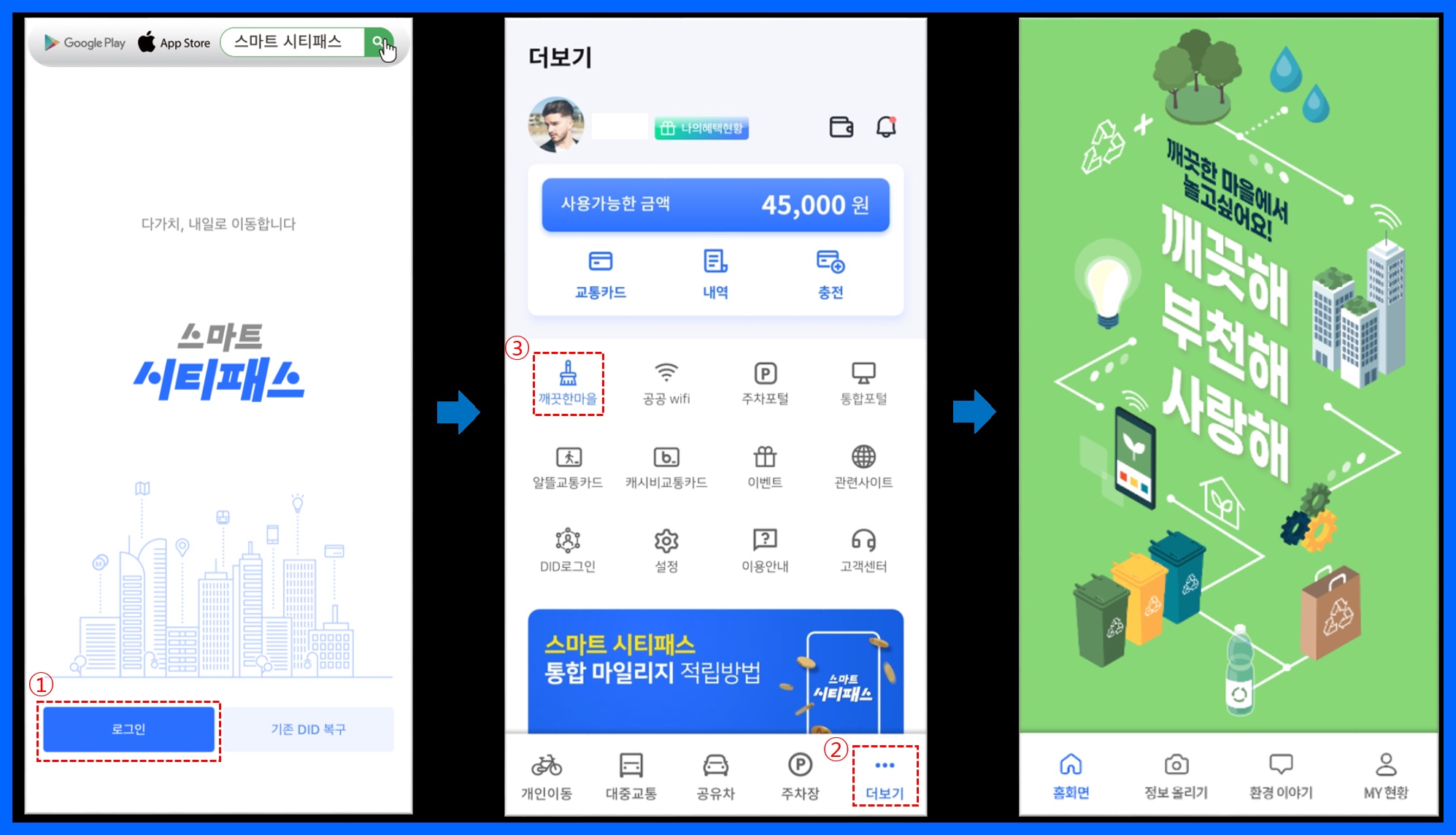 시민들은 스마트 시티패스 앱을 활용하여 ‘정보 올리기(안전신문고)’를 통해 무단투기 장소 등 쓰레기 정보를 게시하거나 ‘환경 이야기’ 코너에 시민들의 활동 및 소식을 게시하면 이용자에게 1일 1회에 한하여 소정의 마일리지를 지급한다.