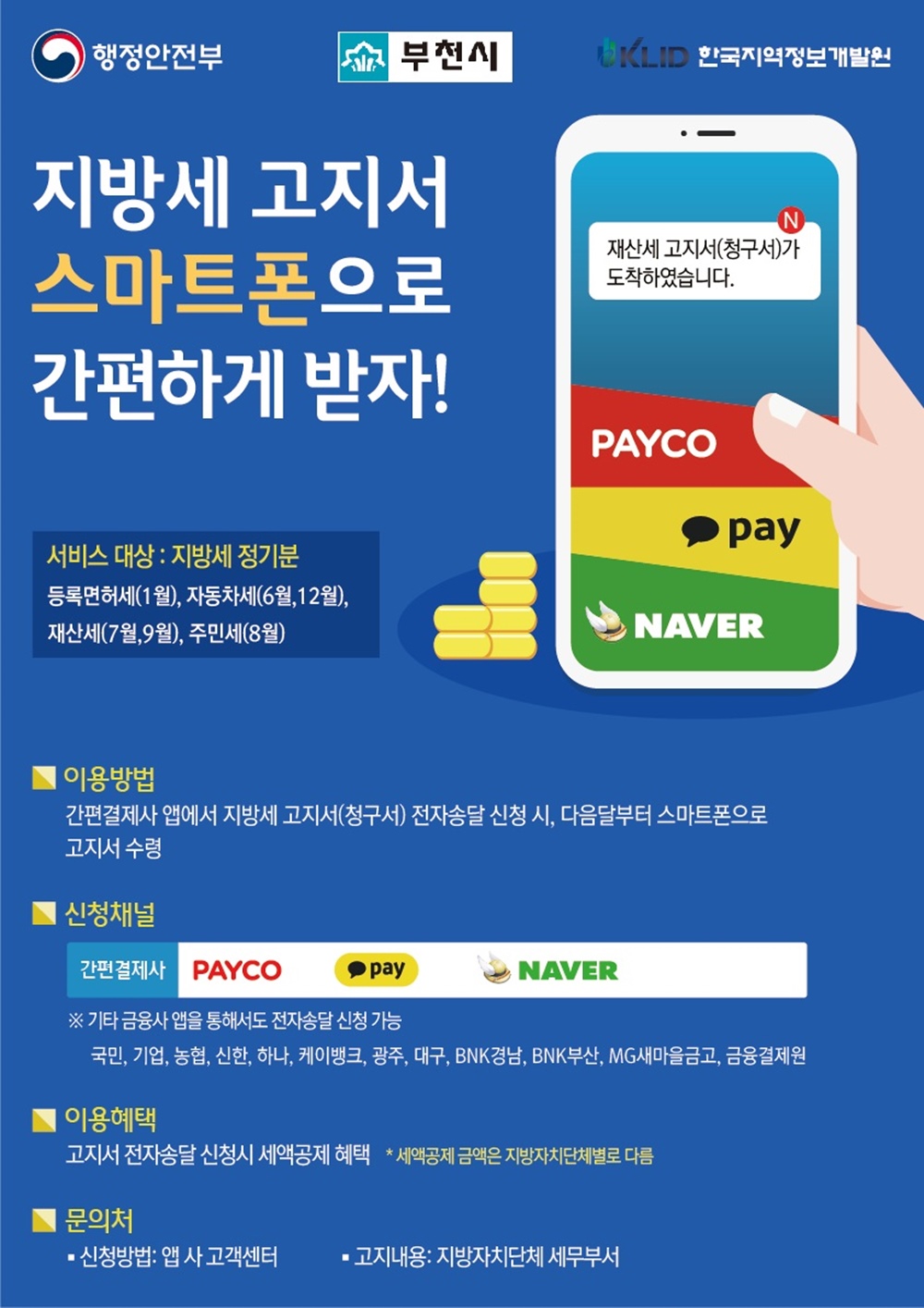 한편 시는 코로나19 재확산으로 대면접촉을 최소화하면서도 원활한 지방세 납부를 위하여 전자고지 및 가상계좌, 간편결제 앱(카카오페이, 네이버, 페이코) 등을 적극 홍보할 예정이다.