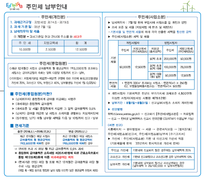 2021년에 주민세 과세체계 개편 내용은 사업주가 7월에 납부하던 재산분과 8월에 납부하던 주민세 개인사업자·법인균등분이 사업소분으로 통합되고 납부기한도 8월로 통일되었다.
