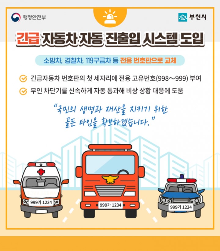 지난 2021년 11월 ‘자동차 등록번호판 등의 기준에 관한 고시’(국토교통부) 개정으로 소방차, 경찰차, 구급차 등에 998 또는 999로 시작하는 전용 번호판을 발급, 무인 차단기가 이 번호를 인식해 긴급자동차가 자동으로 통과할 수 있게 됐다.