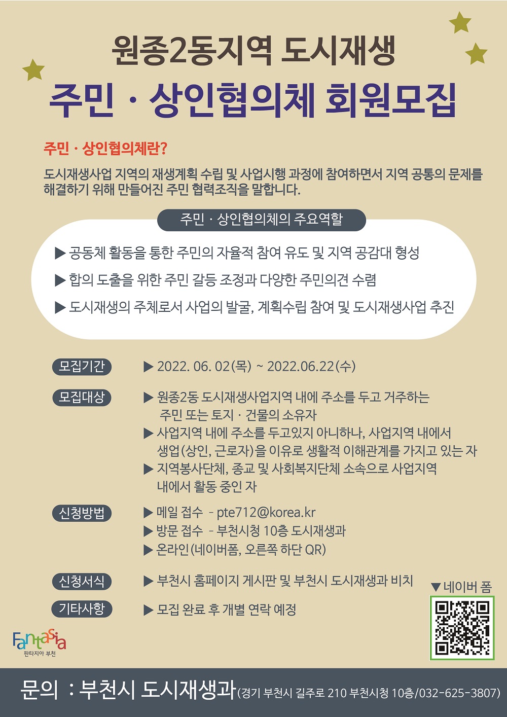 부천시는 오는 6월 22일까지 원종2동지역 도시재생 주민·상인협의체를 모집한다.