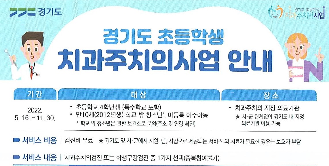 조희진 건강증진과장은 “이번 경기도 초등학생 치과주치의사업을 통해 많은 학생들이 참여하여 구강 건강을 잘 지킬 수 있도록 학교와 학부모의 적극적인 독려를 부탁드린다”고 말했다.