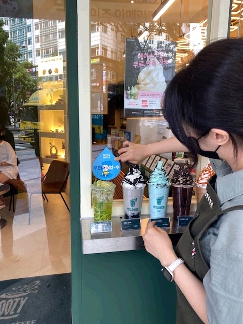 ‘부천핸썹’이 부천 얼~수 매장을 찾아 텀블러에 물을 받는 모습