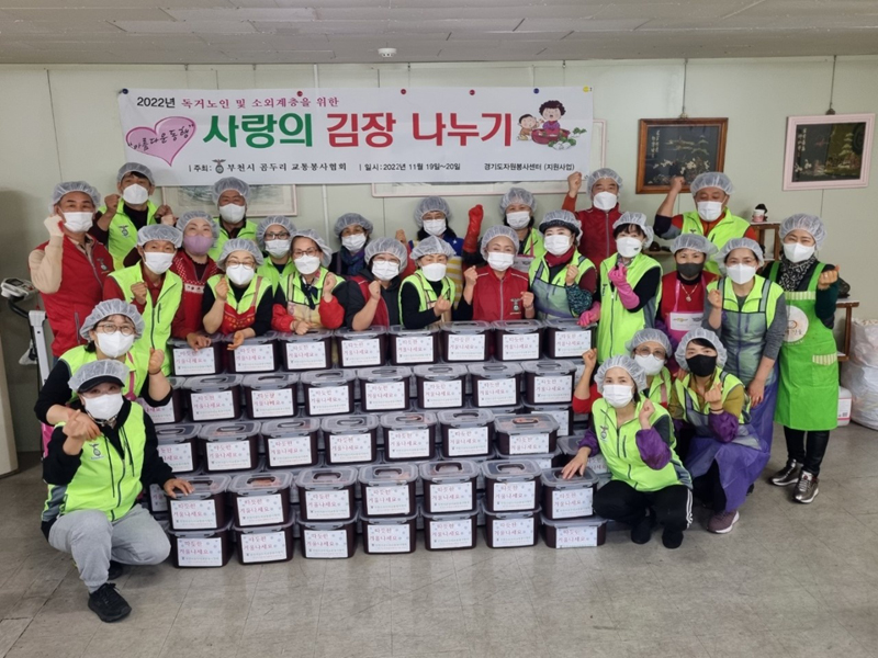 부천시 곰두리교통봉사협회(회장 주관성)는 지난 19일 20일 양일간 그늘지고 소외된 지역주민을 위해 협회 회원과 자원봉사자등 60여명이 참여하여 사랑의 김장나눔 행사를 실시하였다.